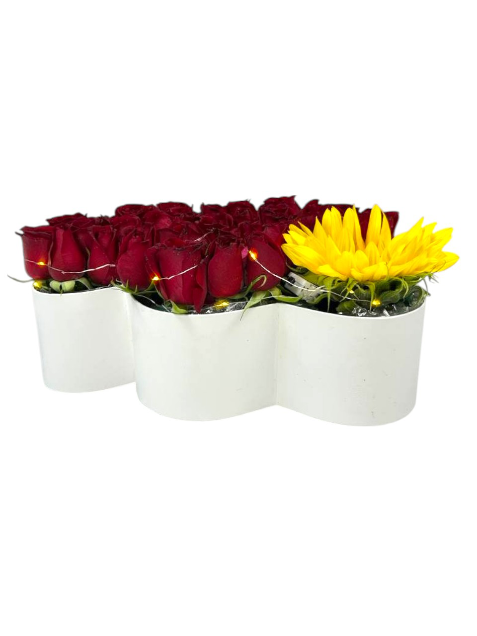 40 rosas rojas, un girasol, caja de corazón doble y una serie de luz LED para brillar juntos en la oscuridad.