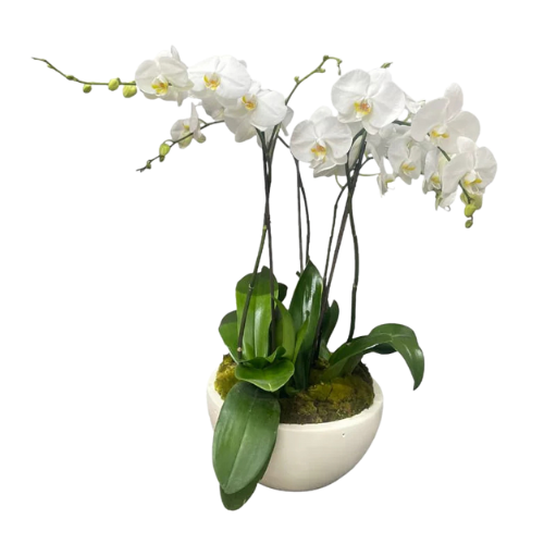 Arreglo Floral de Orquídeas | Arreglo de 4 Orquídeas Blancas en Maceta Redonda Blanca