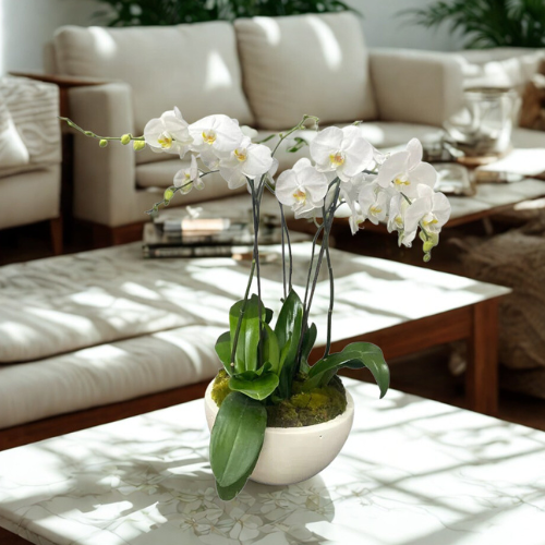 Arreglo de 4 orquídeas blancas en maceta redonda blanca con musgo natural. Elegancia minimalista para decorar o regalar.