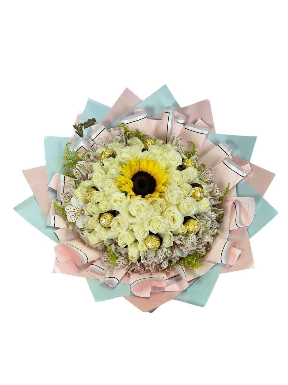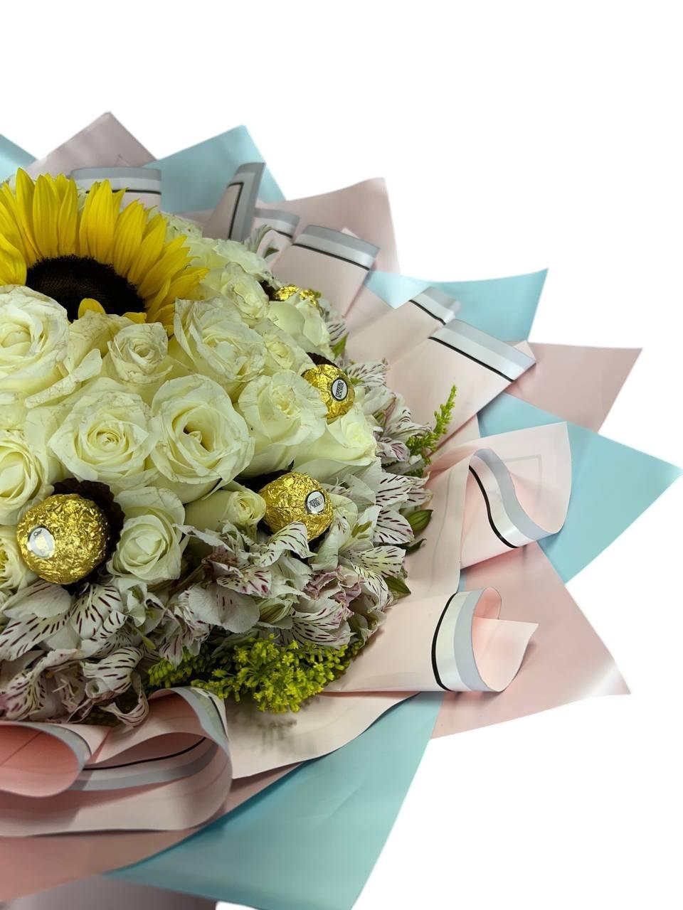 Una mezcla perfecta entre rosas blancas, girasol y chocolates. Regalo dulce y elegante para momentos inolvidables.
