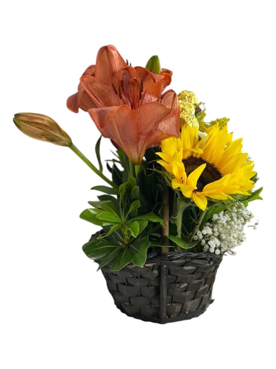 Una composición vibrante y armoniosa que combina la intensidad de 5 lilis rojas, la calidez de 3 girasoles y la pureza de 2 rosas blancas. Acompañado con un follaje fresco de clavo japonés, solidago y baby, todo dispuesto con elegancia en una canasta de mimbre rústica. El toque final: 10 chocolates Ferrero Rocher que suman dulzura al gesto. Ideal para regalar luz, vida y amor en un solo detalle.