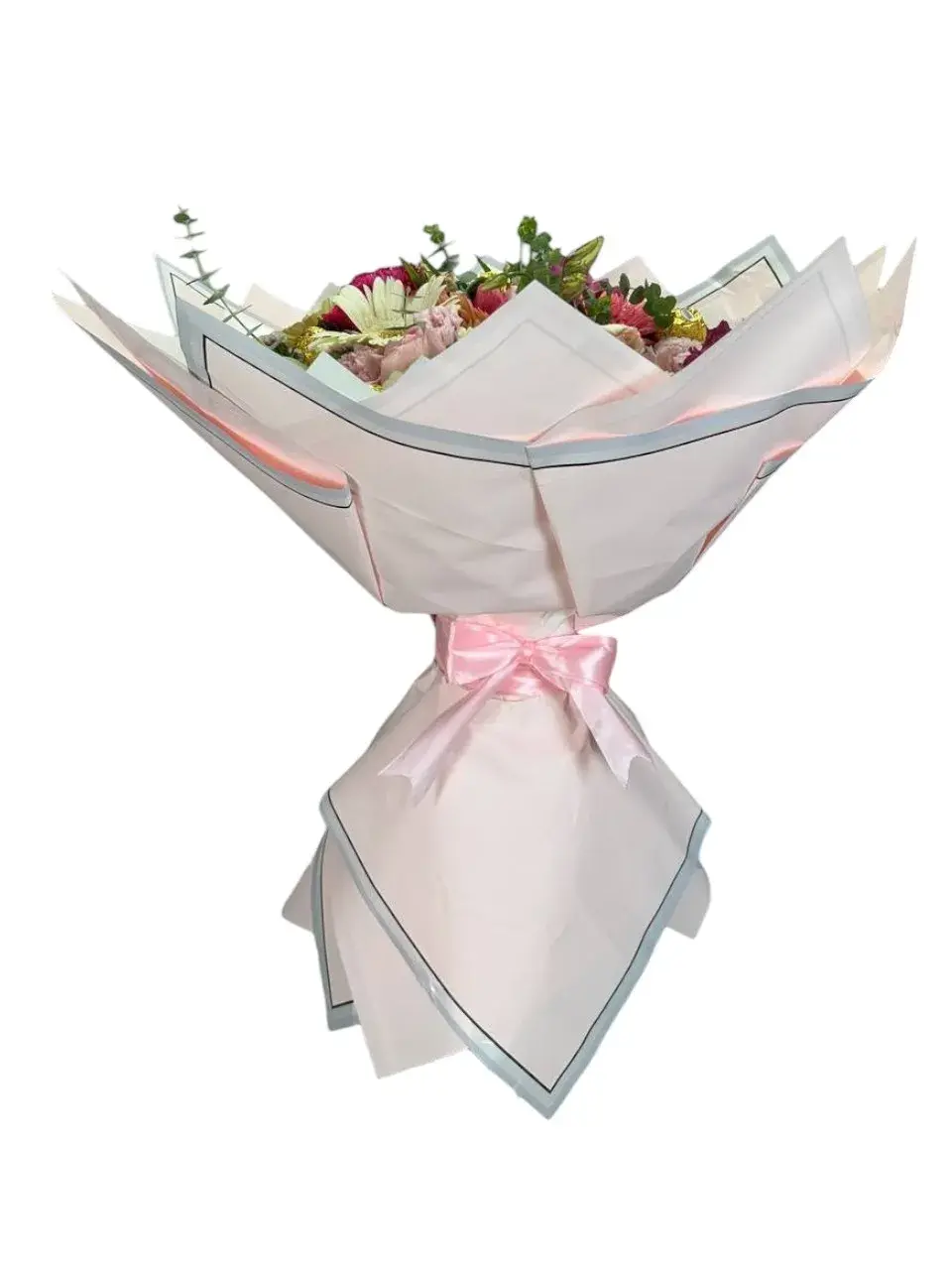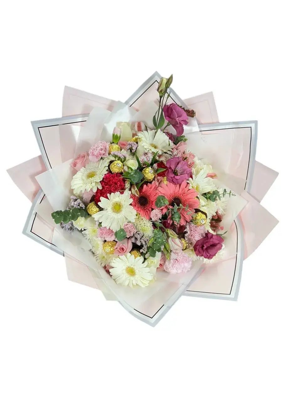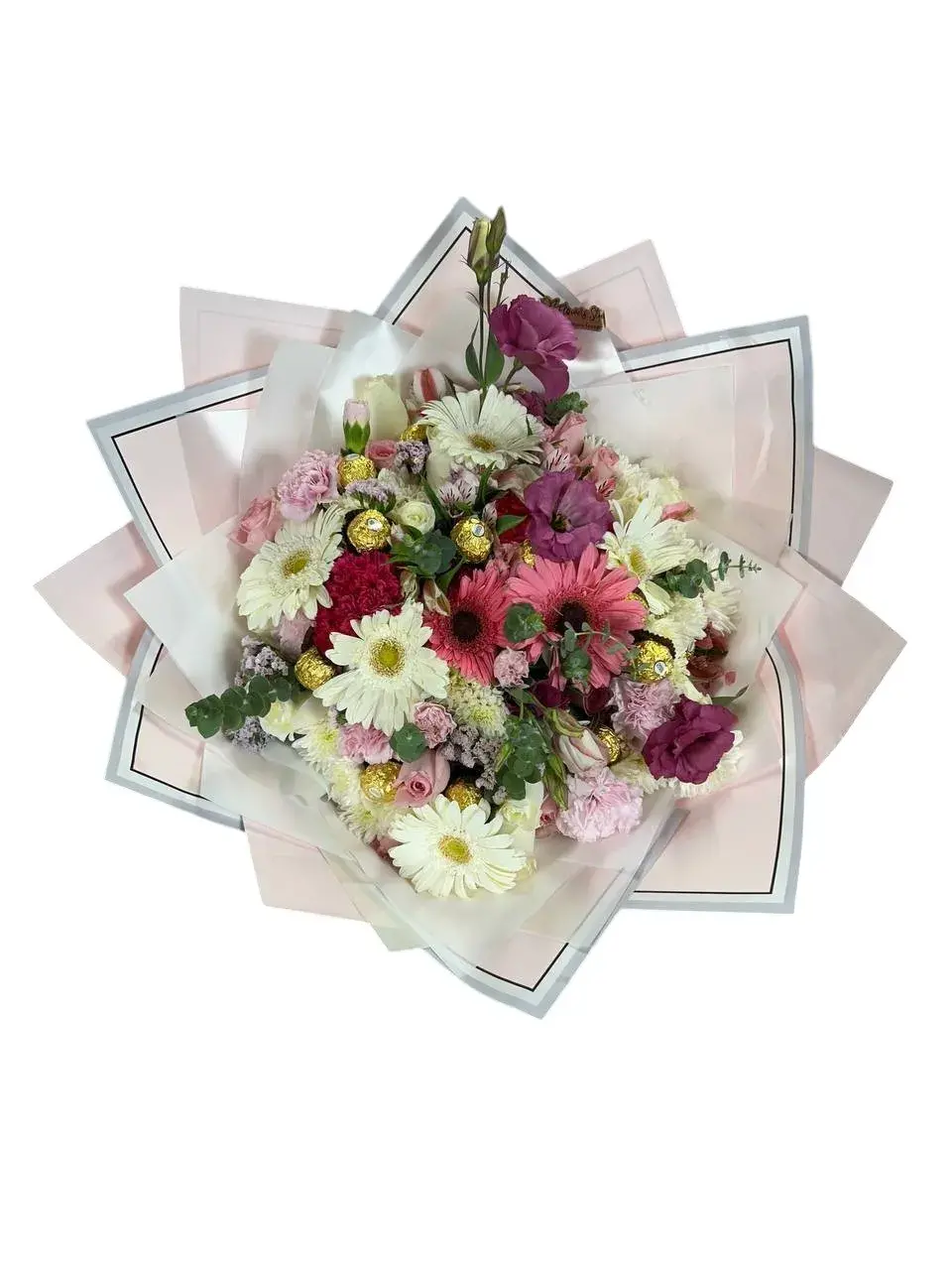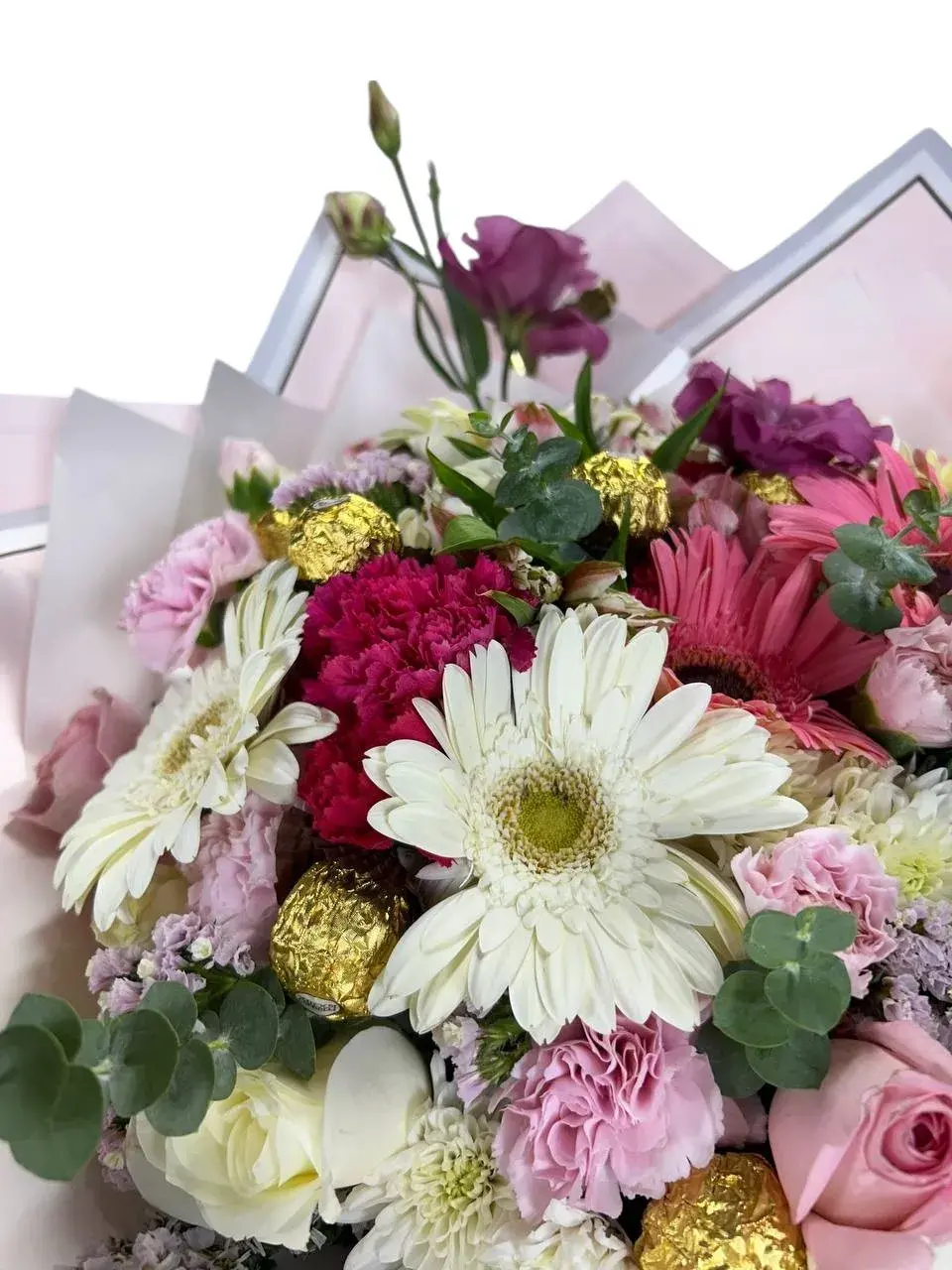 Arreglos mixtos, Flores pastel, Grande, Ramos, Ramos envueltos, Rosas, Rosas BlancasRamo de Rosas y Gerberas con Chocolate | Dulce Armonía
