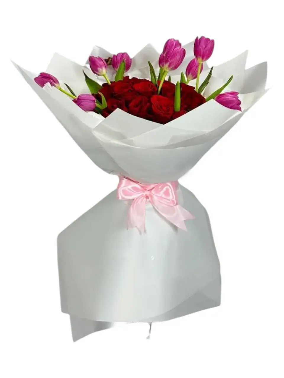Tulipanes fucsia intensifican el mensaje de amor entre las clásicas rosas rojas. Un contraste vibrante que simboliza el amor apasionado y alegre.