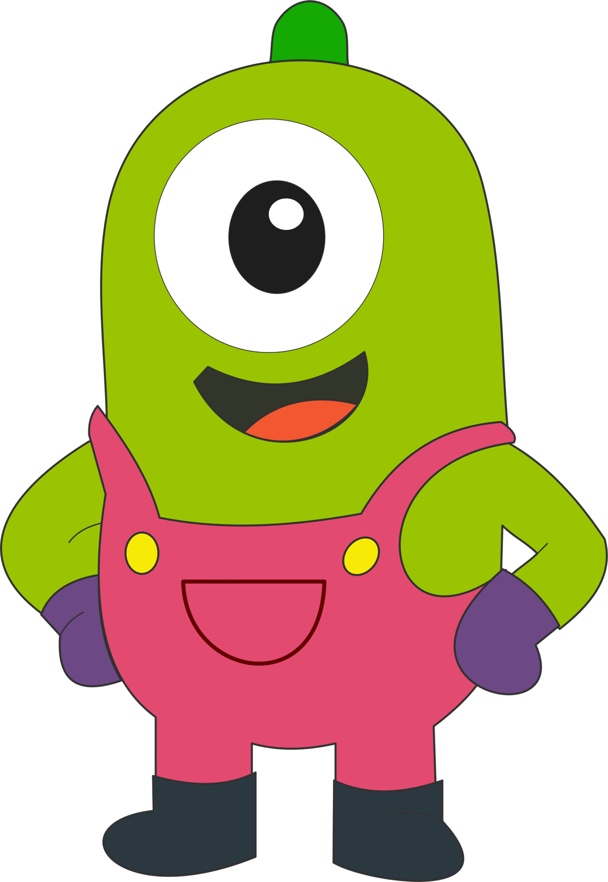 Criatura cilíndrica color verde lima con un solo ojo grande, peto rosa fosforescente y guantes morados.