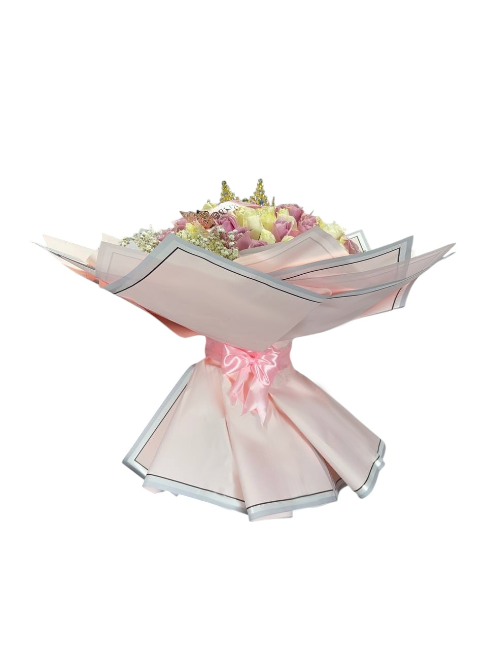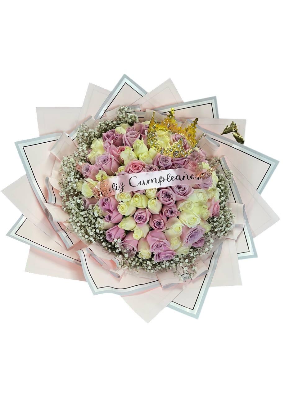 50 rosas (mitad blancas, mitad rosa), una corona y un listón con mensaje hacen de este arreglo un homenaje a la delicadeza y elegancia del amor puro.