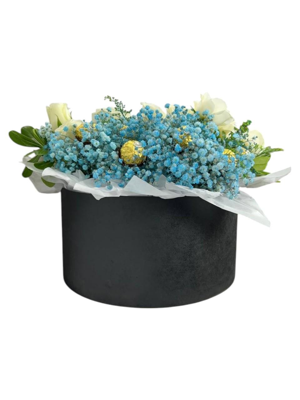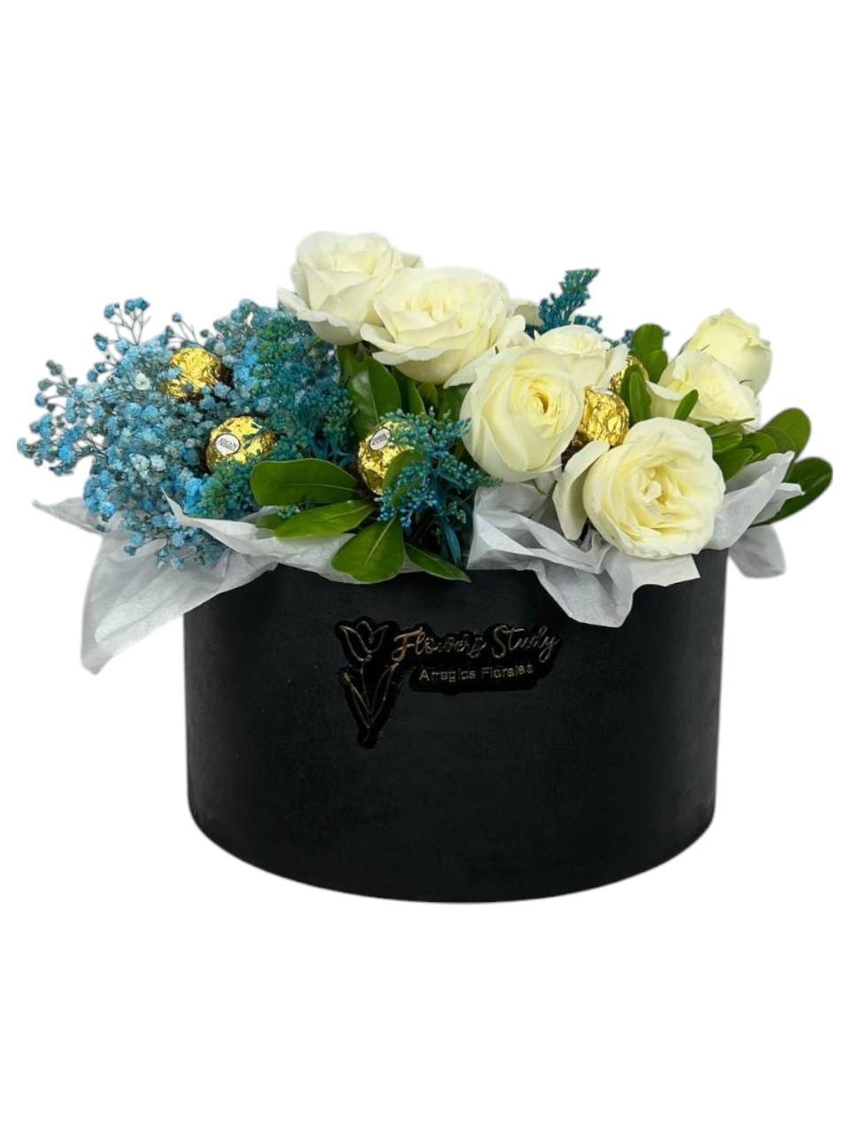 Un delicado homenaje a la ternura. Dieciocho rosas blancas en una caja circular de madera, acompañadas de diez chocolates Ferrero. Ideal para expresar paz, agradecimiento o cariño sincero