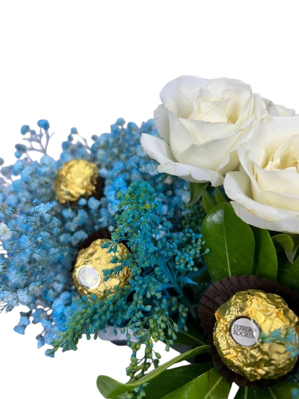 31 valoraciones en Arreglo Floral de Rosas con Ferrero | Pureza y Dulzura