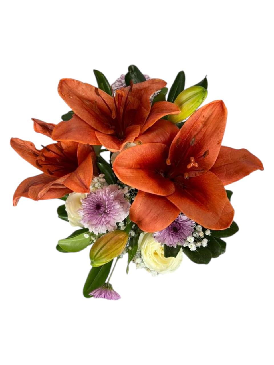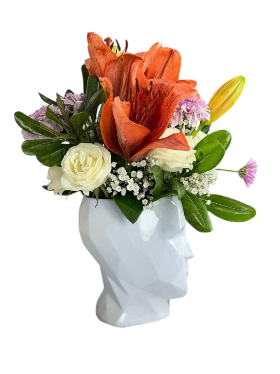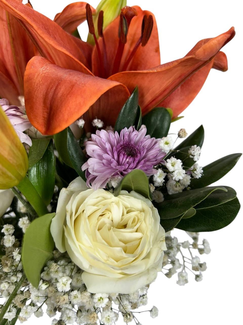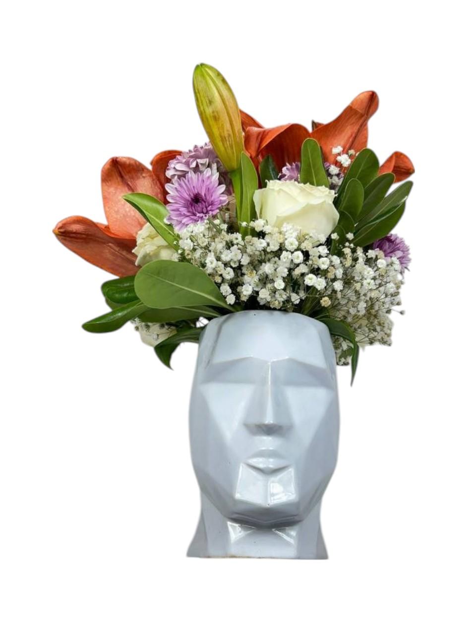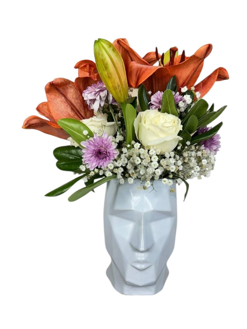 Delicadeza blanca y frescura natural se encuentran en este arreglo minimalista. Las lilis y rosas blancas transmiten paz y claridad, en una maceta de diseño moderno que armoniza cualquier espacio.