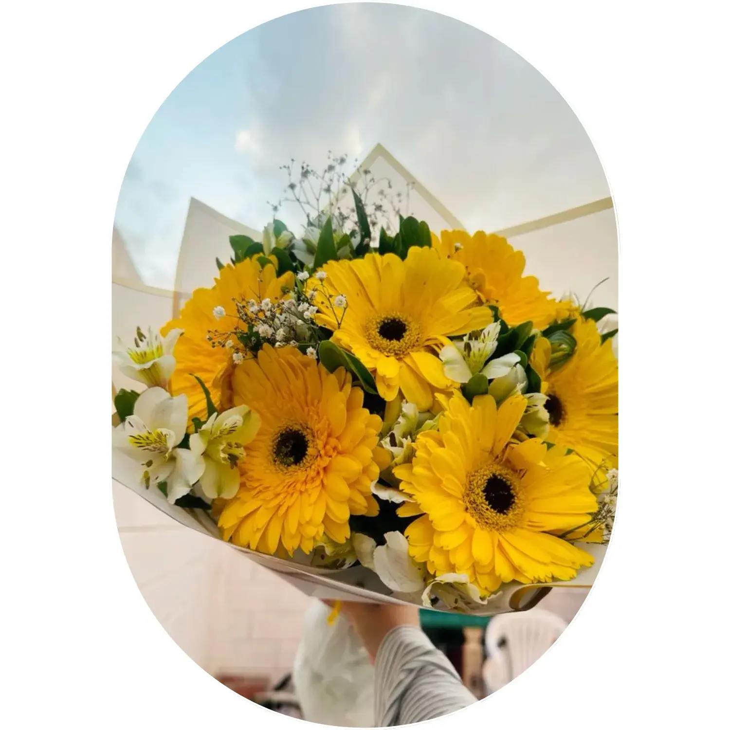 orprende con un radiante ramo de 10 gerberas amarillas acompañado de follaje mixto, una opción llena de energía positiva y frescura. Las flores amarillas, como las gerberas, son símbolo de amistad y optimismo, convirtiendo este detalle en el regalo perfecto para el 21 de septiembre o cualquier celebración especial.