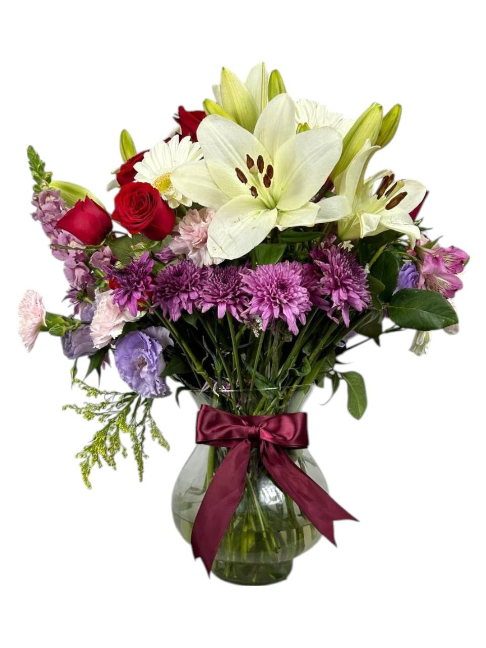 Doce rosas rojas con lilis y gerberas blancas, un clásico para declarar amor eterno