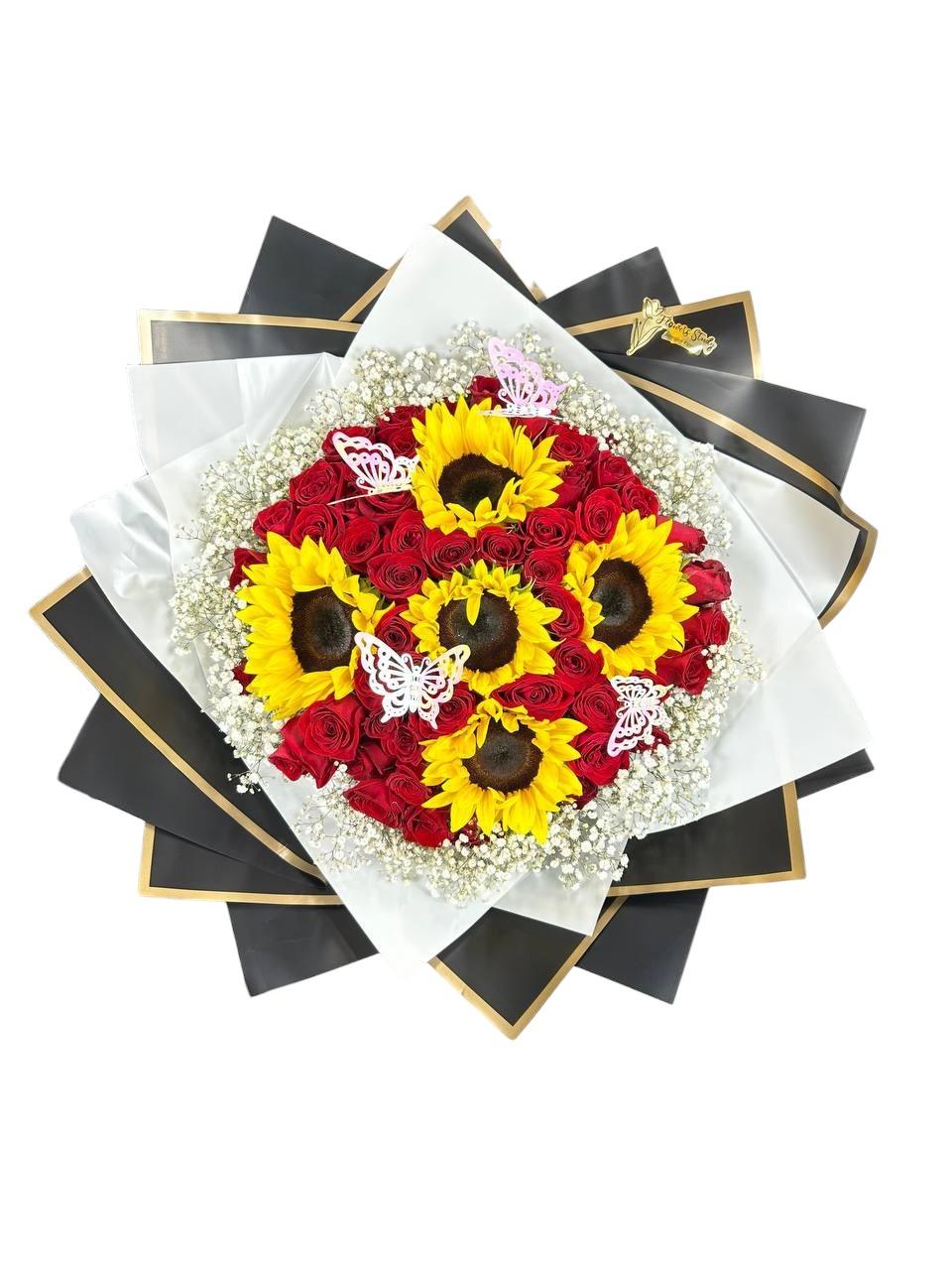 Ramo de 50 Rosas Rojas y Girasoles con Mariposas | Susurros de Mariposa
