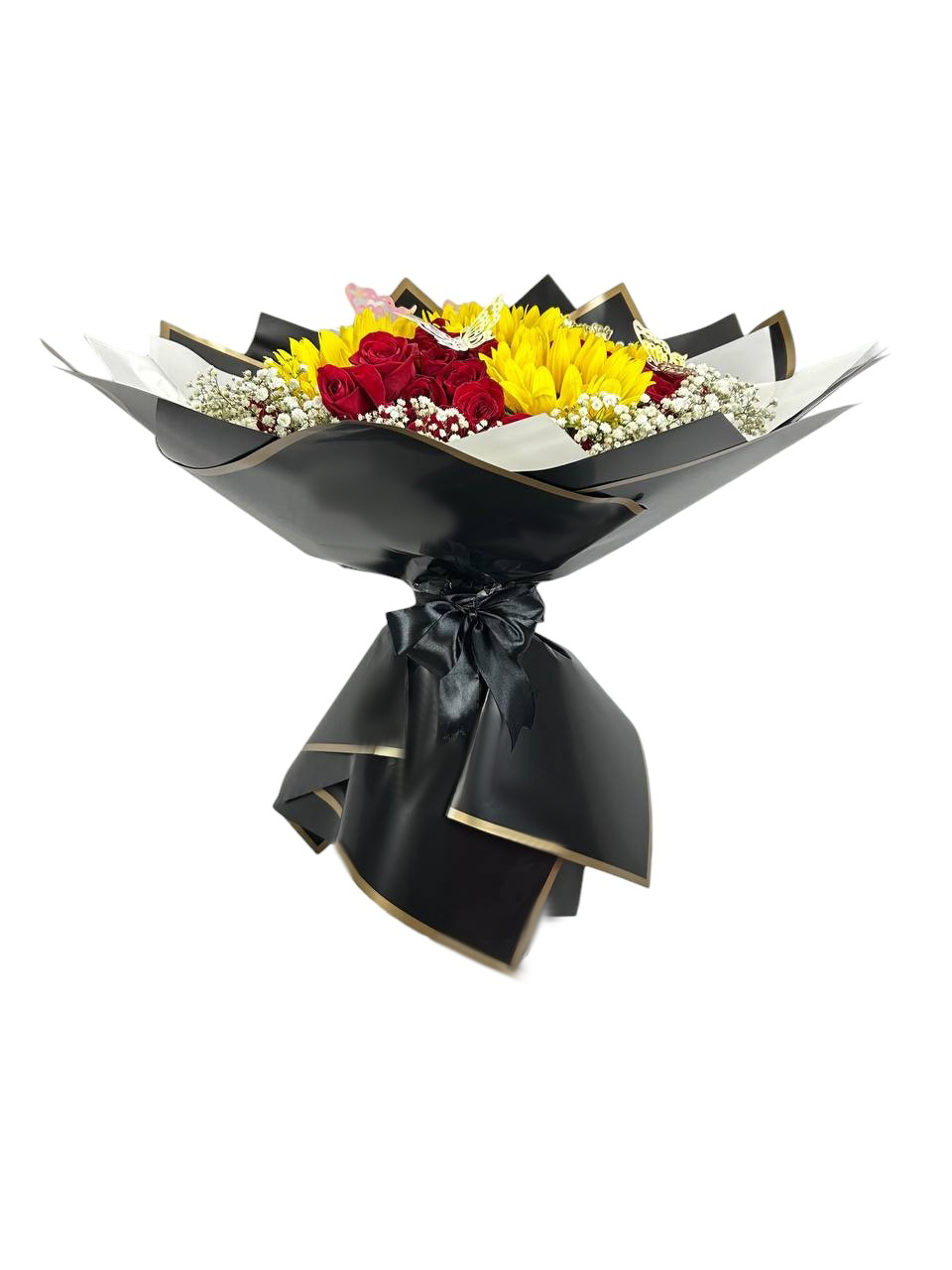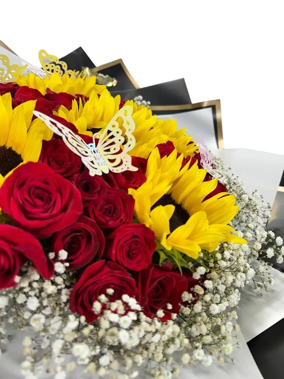 Las mariposas revolotean entre 50 rosas rojas y girasoles vibrantes, trayendo consigo un mensaje de transformación, esperanza y nuevos comienzos. Ideal para momentos de cambio o celebración.